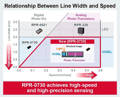 RPR-0730 "is a reflective small proximity sensor (reflective photoelectric sensor * 1). By using infrared VCSEL * 2, which has better directionality than LED, as the light-emitting element, detection of finer targets has been achieved. In addition, by using a phototransistor with analog output function * 3 as the light receiving element, a high-speed response performance of 10 microseconds (µ s) is achieved. By combining these two advantages, it is possible to quickly and accurately identify fine wire bodies with a width of 0.1mm that are difficult to detect with traditional LED light sources. As a new member of the "RPR-0720" series of digital output products, this product has a wider range of applications, including print detection for copiers and label printers, rotation detection for motors and gears, and other applications that require higher speed sensing.