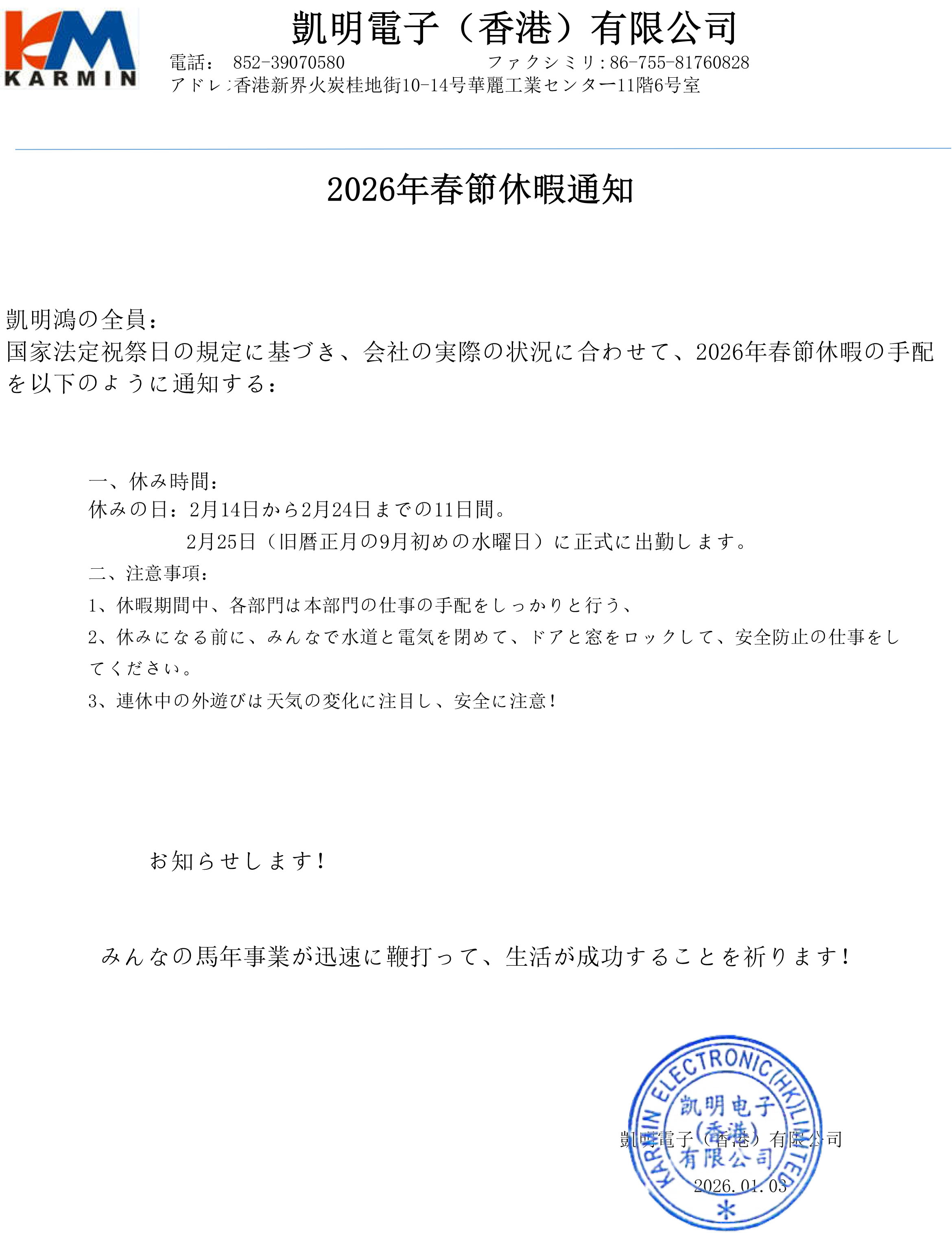 2026年春節休暇通知