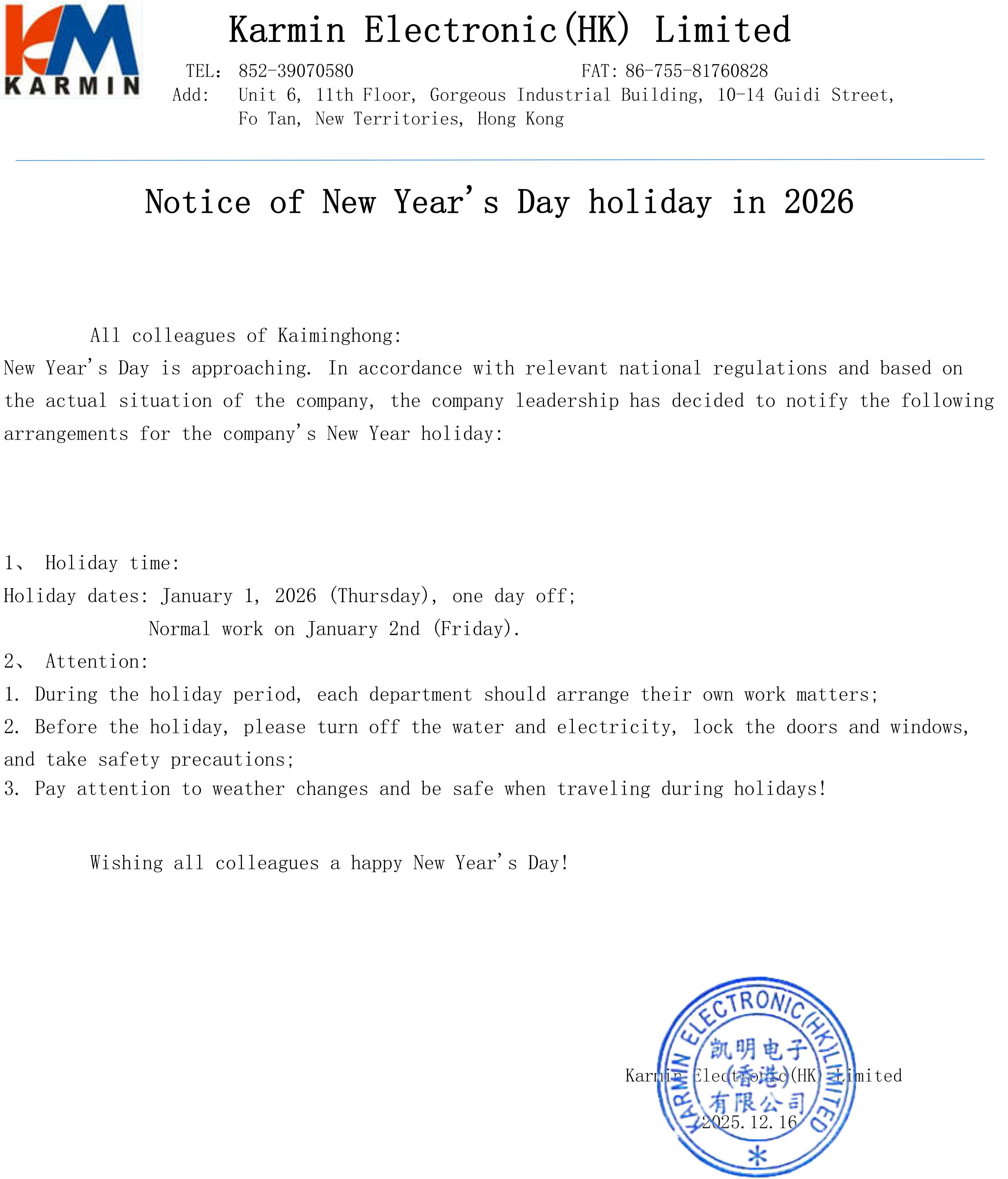 Notice of New Year’s Day holiday in 2026